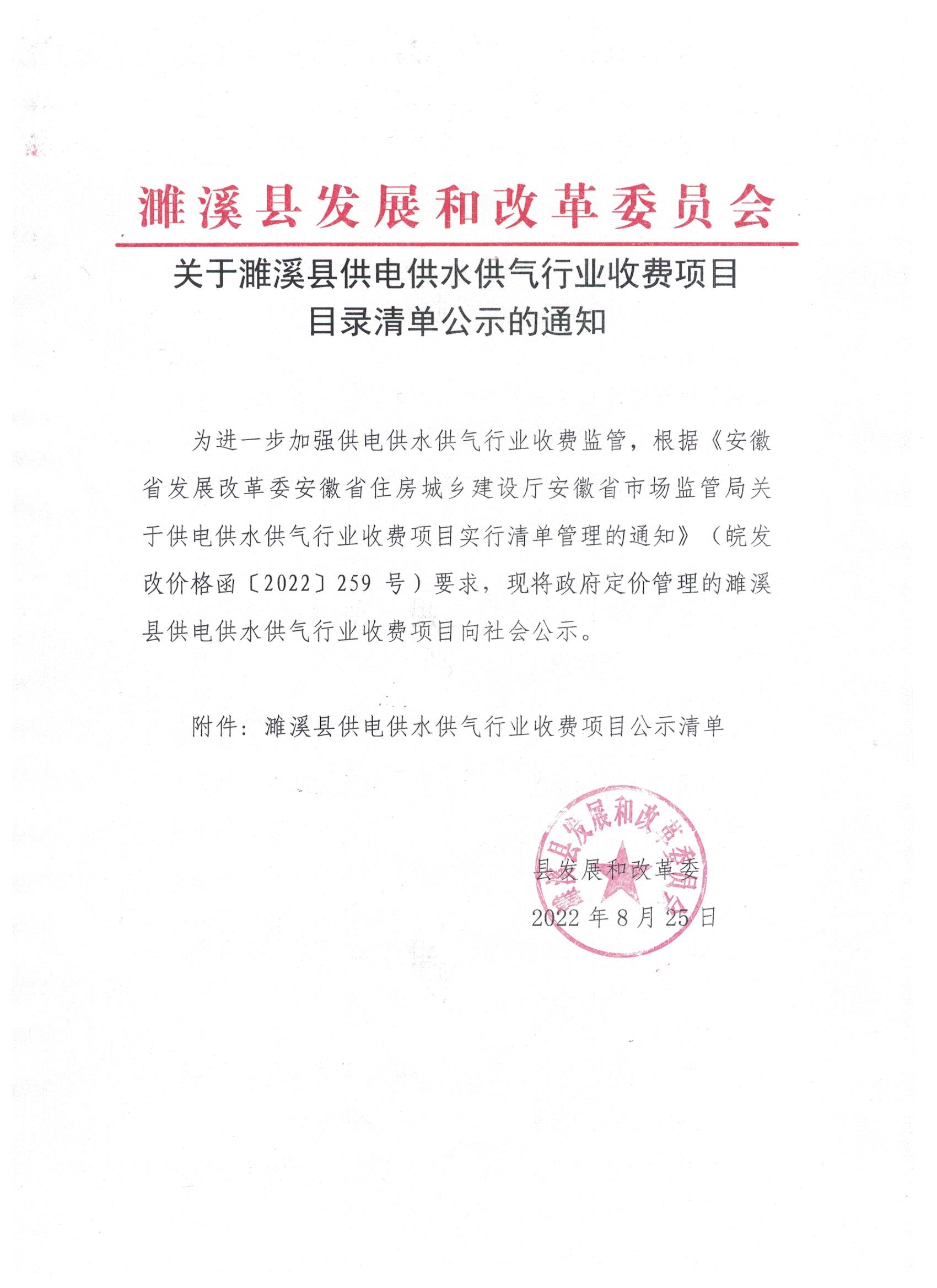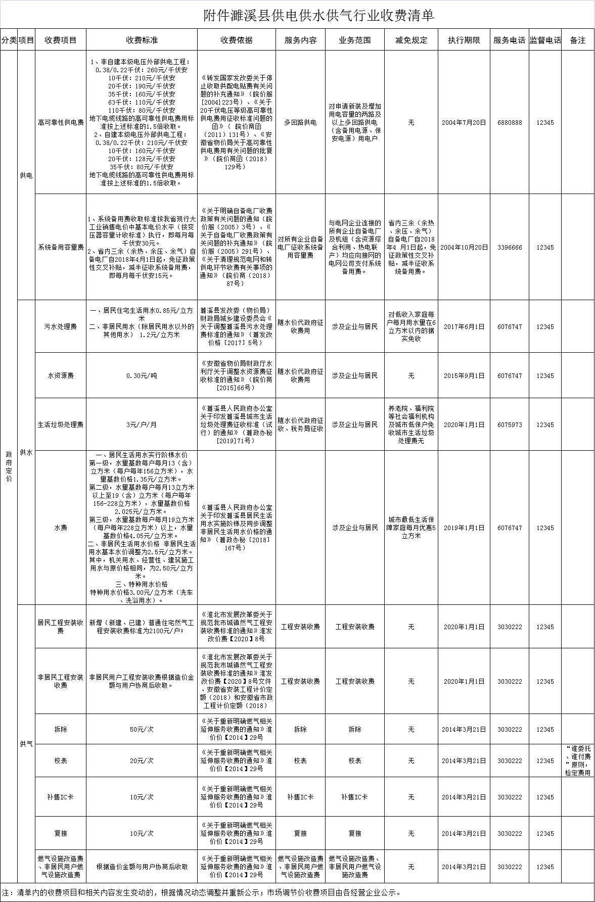 關(guān)于濉溪縣供電供水供氣行業(yè)收費(fèi)項目目錄清單公示的通知